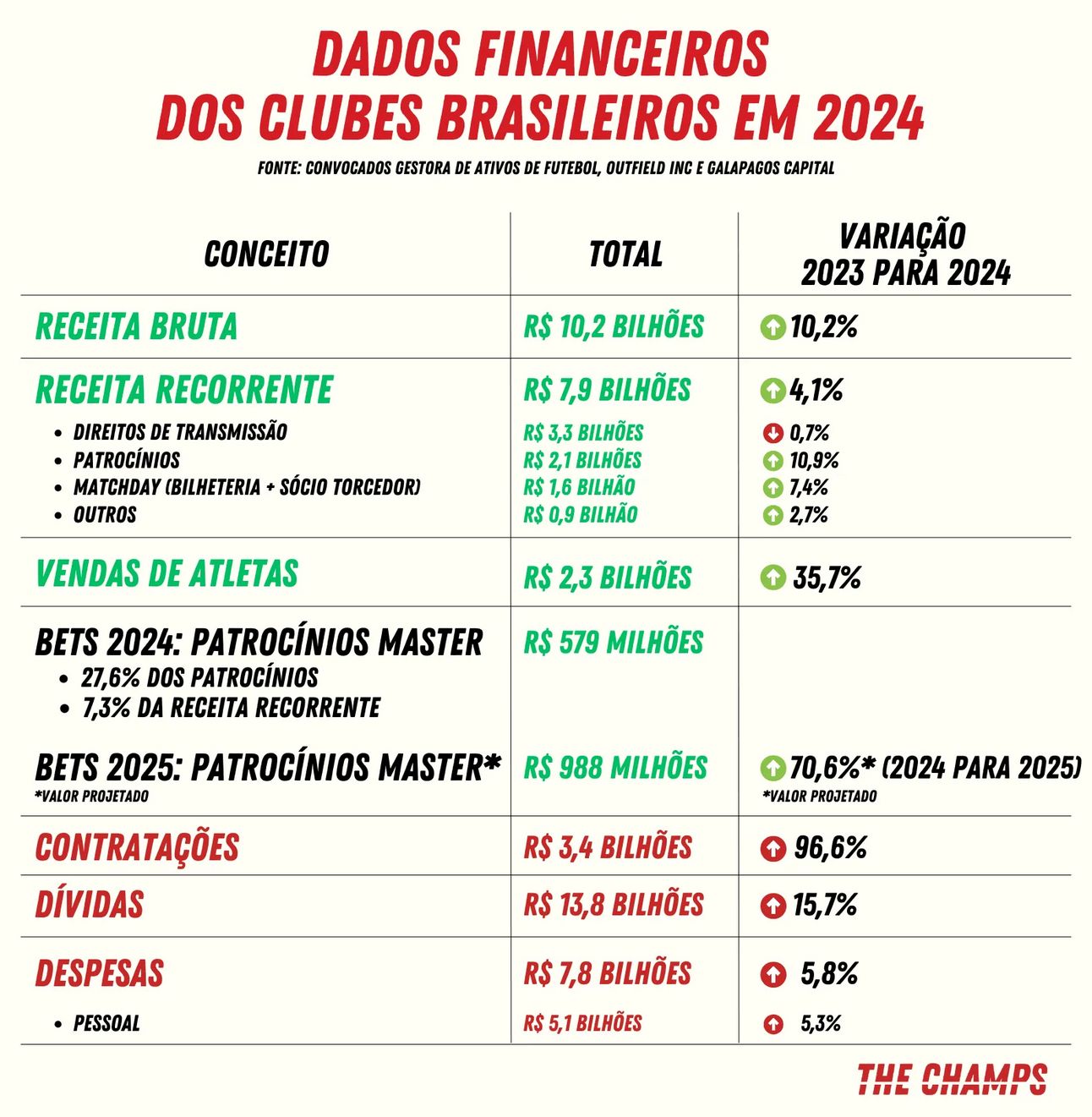 Maaas… o dinheiro é investido em contratações, o que leva os clubes a gastarem cada vez mais com salários e, consequentemente, a aumentarem suas dívidas. De 2023 para 2024, o crescimento dos passivos foi de 15,7%, percentual superior ao aumento das receitas — e é aí que mora a preocupação.