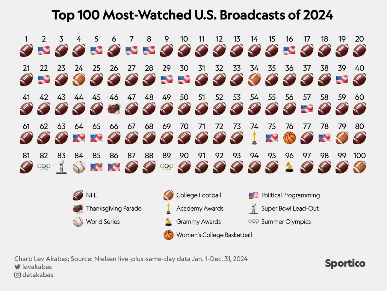 Os americanos só querem saber de uma coisa: NFL 🏈. A liga profissional de futebol americano voltou a sobrar em 2024 ao garantir 72 dos 100 eventos mais assistidos na televisão americana.