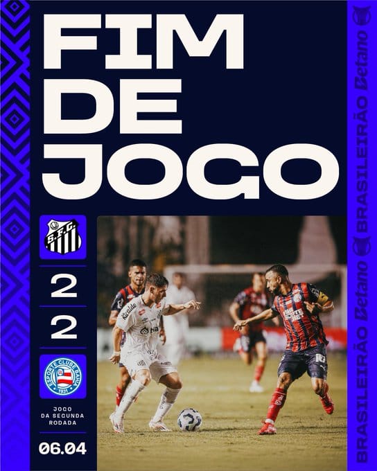 O Bahia abriu o placar com Erick aos 17’ do 1T, após bela jogada da equipe. No 2T, o Santos empatou aos 5’ com Thaciano — sem deixar a Lei do Ex falhar — e virou aos 36’, nesse belo gol de Diego Pituca.