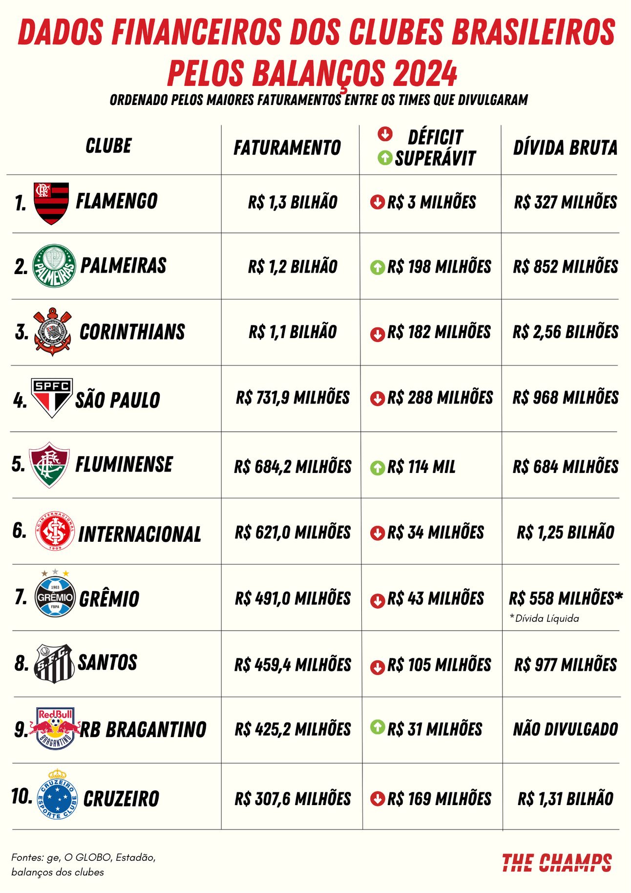 O Flamengo, maior arrecadação em 2024 com R$ 1,3 bilhão — 4º ano consecutivo acima do bilhão —, viu suas dívidas aumentarem para R$ 327 milhões, muito em função da compra de jogadores e do terreno de seu futuro estádio.