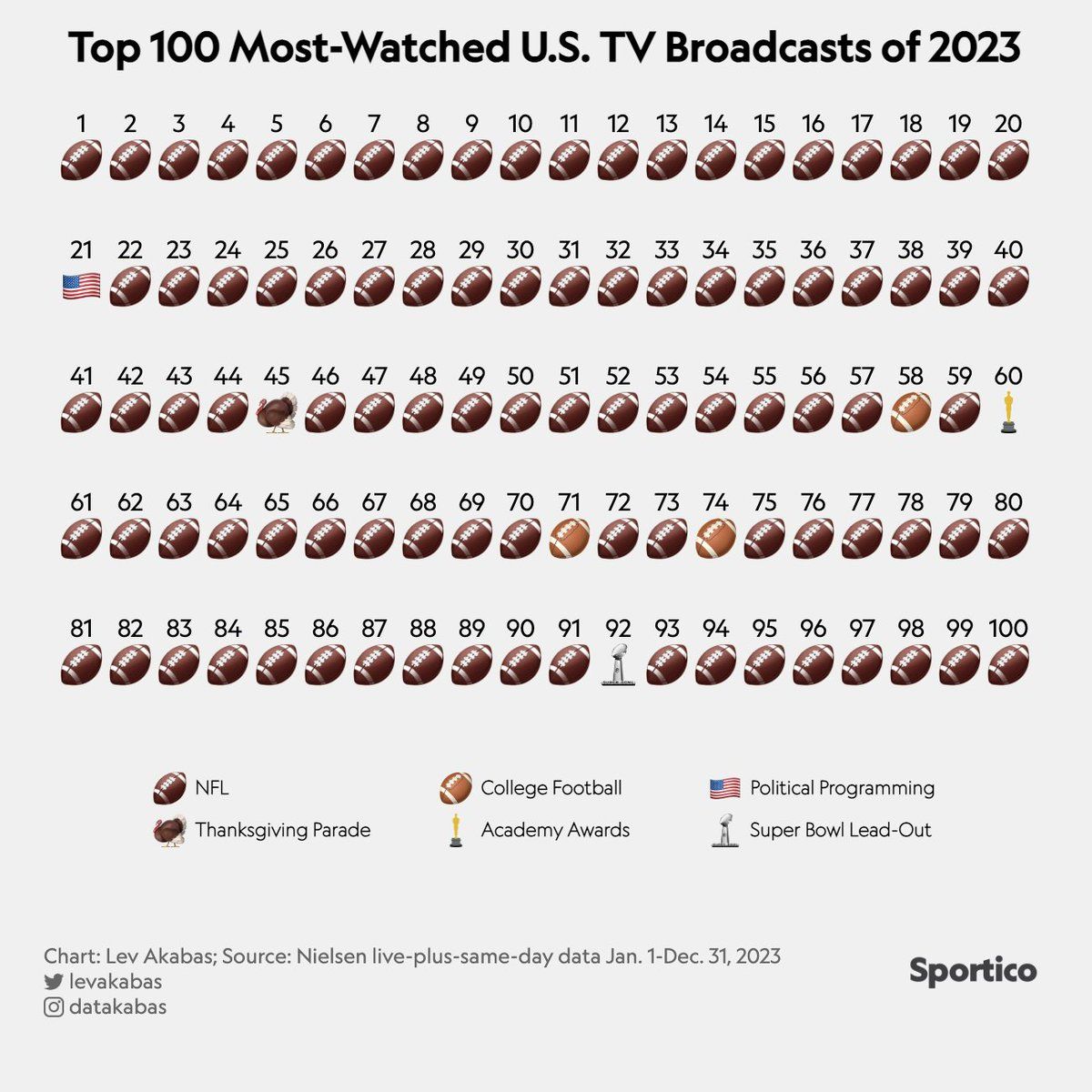 Sendo assim, 97% das grandes programações televisivas americanas em 2023 foram ligadas ao futebol americano. Apenas um programa político, o Oscar e o Desfile de Ação de Graças tiveram uma alta relevância sem ter ligação com a bola oval.