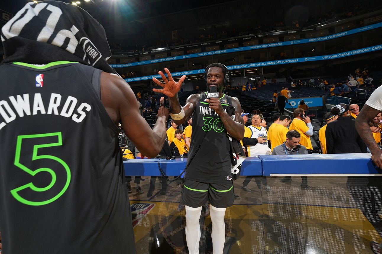 🌉 Dupla inspirada. Com triplo-duplo de Julius Randle e combinação de 50 pontos dele com Anthony Edwards, Minnesota abre 2-1 em San Francisco. Curry ainda é dúvida;