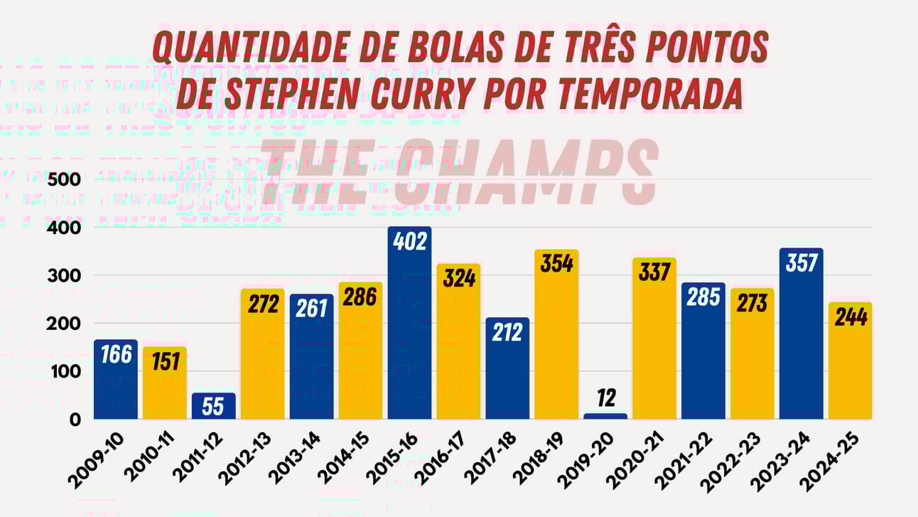Em todas as temporadas que não alcançou 200 bolas de três, Curry teve algum tipo de contusão que o afastou por tempo considerável, uma prova notável de sua consistência e durabilidade.