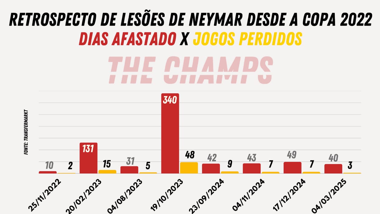 As lesões não são novidade na carreira de Neymar. Desde 2014, ele precisou se recuperar em alguma parte em todas as temporadas, acumulando 1.145 dias fora dos gramados — o equivalente a mais de 3 anos em tratamento — e 249 partidas perdidas.