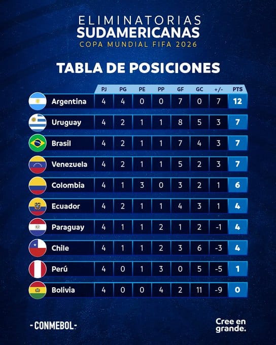 Bom, depois de 4 jogos — 2 vitórias, 1 empate e uma derrota — assim está a classificação das Eliminatórias: