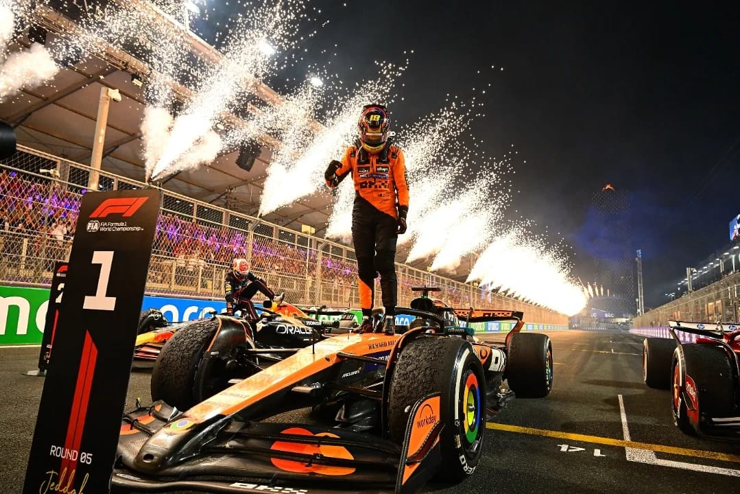 🆕1️⃣ Liderança inevitável. Oscar Piastri assumiu a ponta do Mundial de Fórmula 1 após vencer o GP da Arábia Saudita — sua 3ª vitória em 5 etapas disputadas até aqui. Verstappen e Leclerc completaram o pódio.