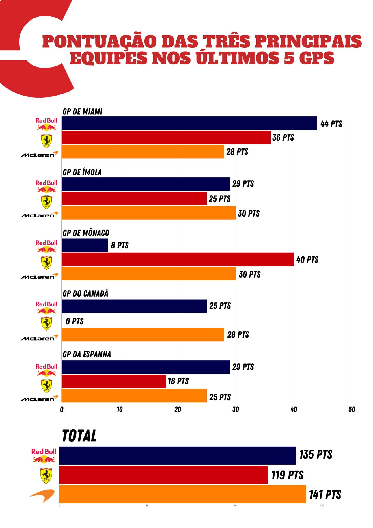 📈 A McLaren somou mais pontos nos últimos 5 Grandes Prêmios que a Red Bull de Max Verstappen e Sergio Pérez.